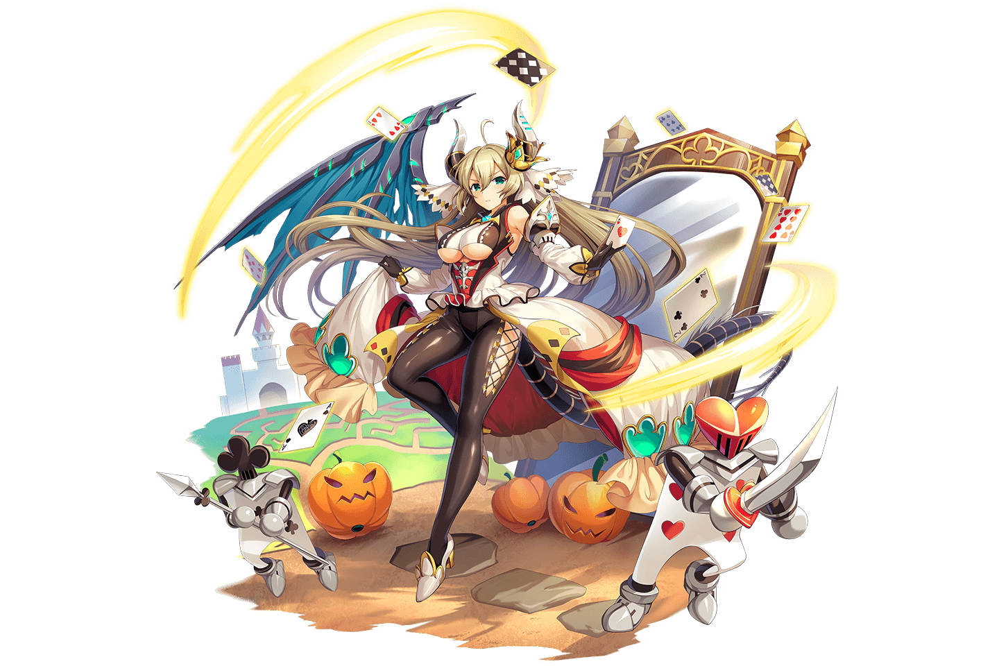 大好きなトランプ、それに合う衣装へ仮装したジャバウォック。 大きな鏡と、そこから生じる兵士達は、かつての力の名残である。 |